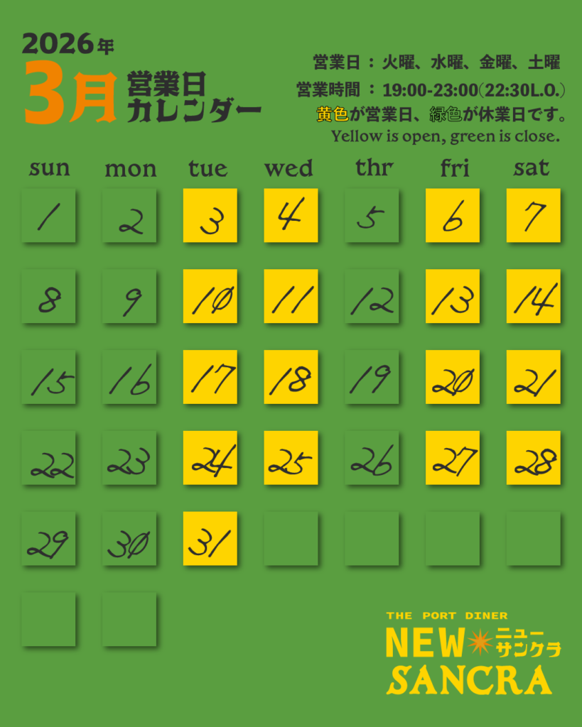 Also, although this announcement comes a bit later than usual, here are our opening days for March. On a personal note, it has been a busy month for me, as I traveled to Tokyo to attend a food exhibition. I discovered many interesting foods and cultural ideas there, and I hope to share some of them with you here at the bar in the near future.